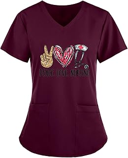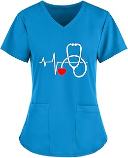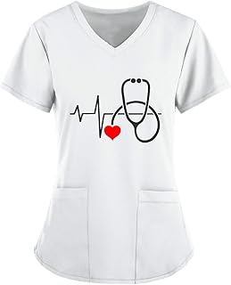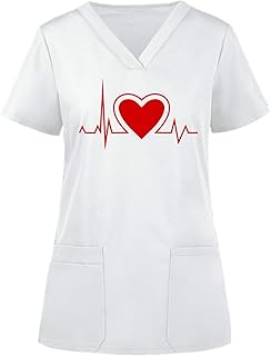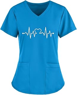 Damen Arbeitskleidung Herzschlag Motiv V-Ausschnitt Schlupfkasack Pflege Kasack Bluse Top Krankenhaus Schlupfjacke Kurzarm Berufsbekleidung für Medizing und Pflege Unisex Uniform