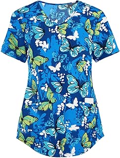 Jinchan Damen Arbeitskleidung Uniformen, Schmetterling Drucken Mediznischer V-Ausschnitt Kurzarm Schlupfkasack Damen Übergröße Kasack Pflege mit Taschen, Krankenpfleger Berufskleidung Nurse